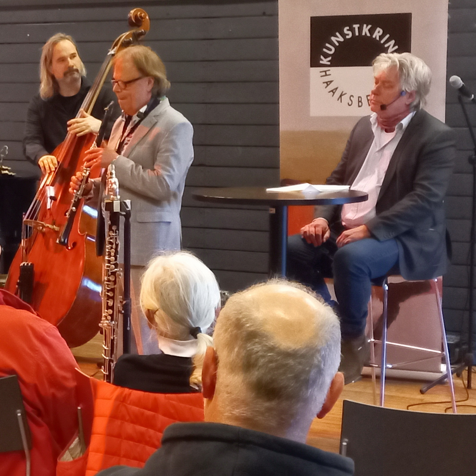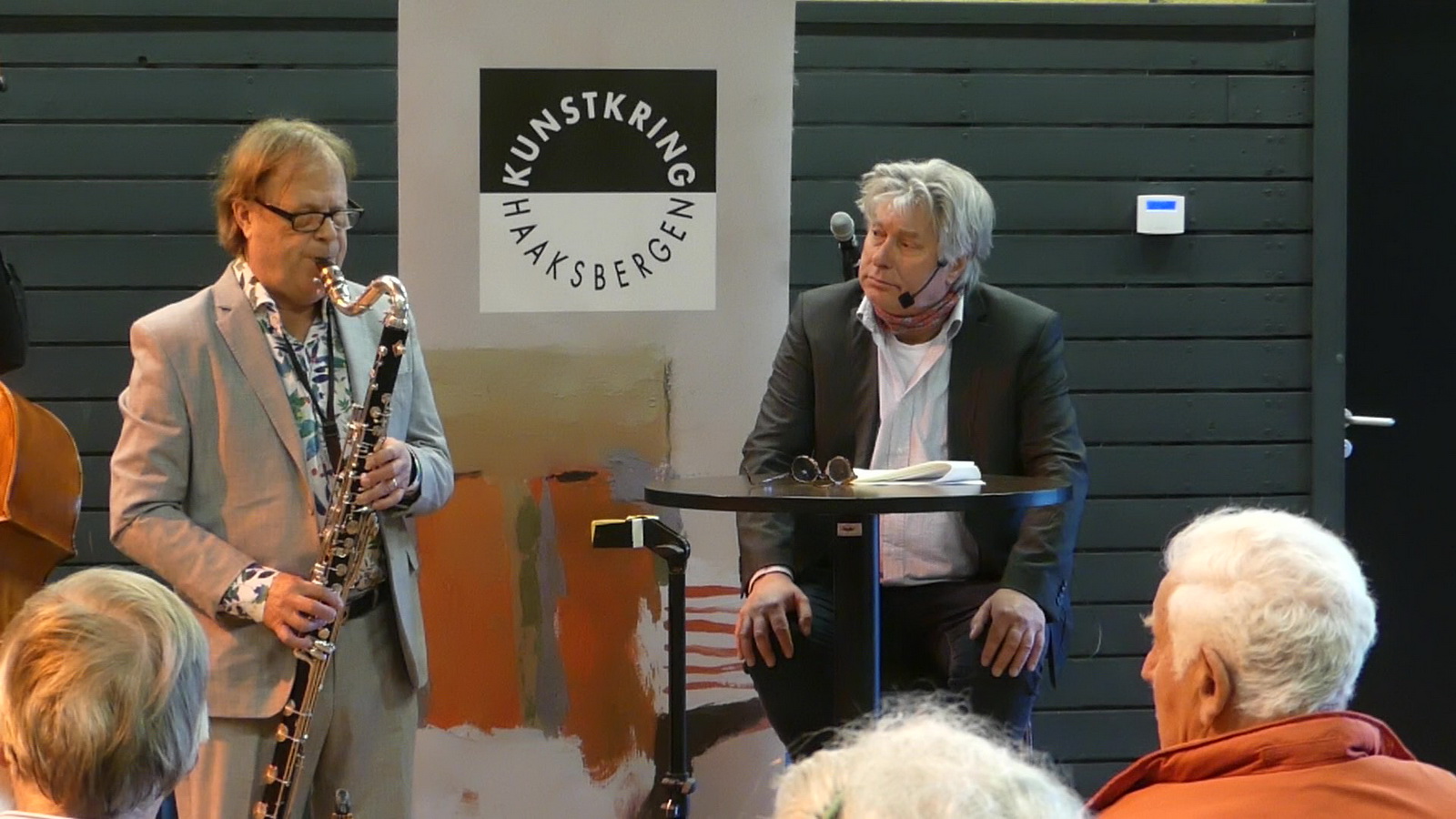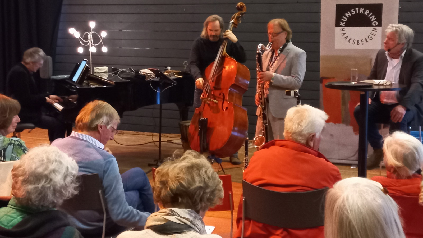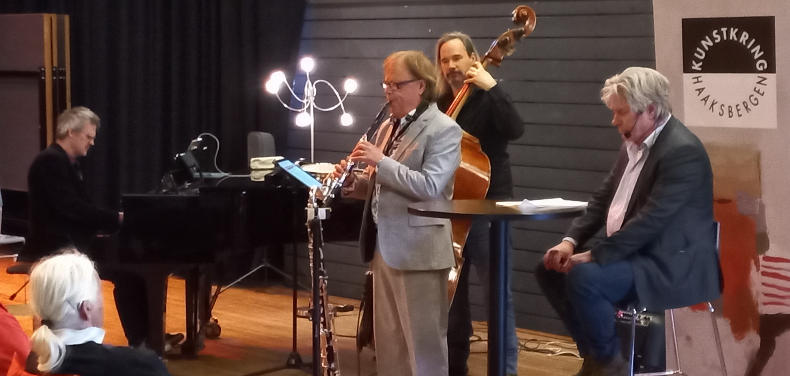 Borboleta Music bracht deze zondagmiddag het programma ‘Muziek en Literatuur’. Het was het laatste concert in de serie zondagmiddagconcerten van het Kunstkringseizoen 2025-2026. Met gast Paul Abels ging klarinettist André Kerver, bijgestaan door Christoph McCarthy op piano en Ulli Wenslaf-Eggebert op contrabas, op zoek naar de grenzen en raakvlakken met de geschreven literatuur. Dit zondagmiddagconcert van de Kunstkring Haaksbergen was de reprise van een concert in november vorig jaar in Jazz Podium de Tor in Enschede. Maar geheel passend bij het uitgangspunt van Borboleta Music werd het een compleet andere voorstelling, die werd bijgewoond door slechts een kleine 45 liefhebbers. Tegen een onverwacht mooie lentedag is ook voor zo’n prachtconcert geen kruit gewassen. Maar de wél-aanwezigen hebben genoten van een fantastische middag. De ontroerende, serieuze, humoristiche en soms hilarische korte verhalen van Paul Abels werden virtuoos muzikaal omlijst door de drie improviserende musici.