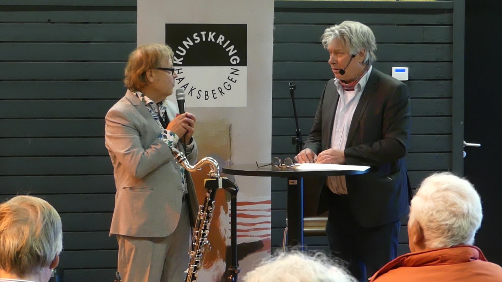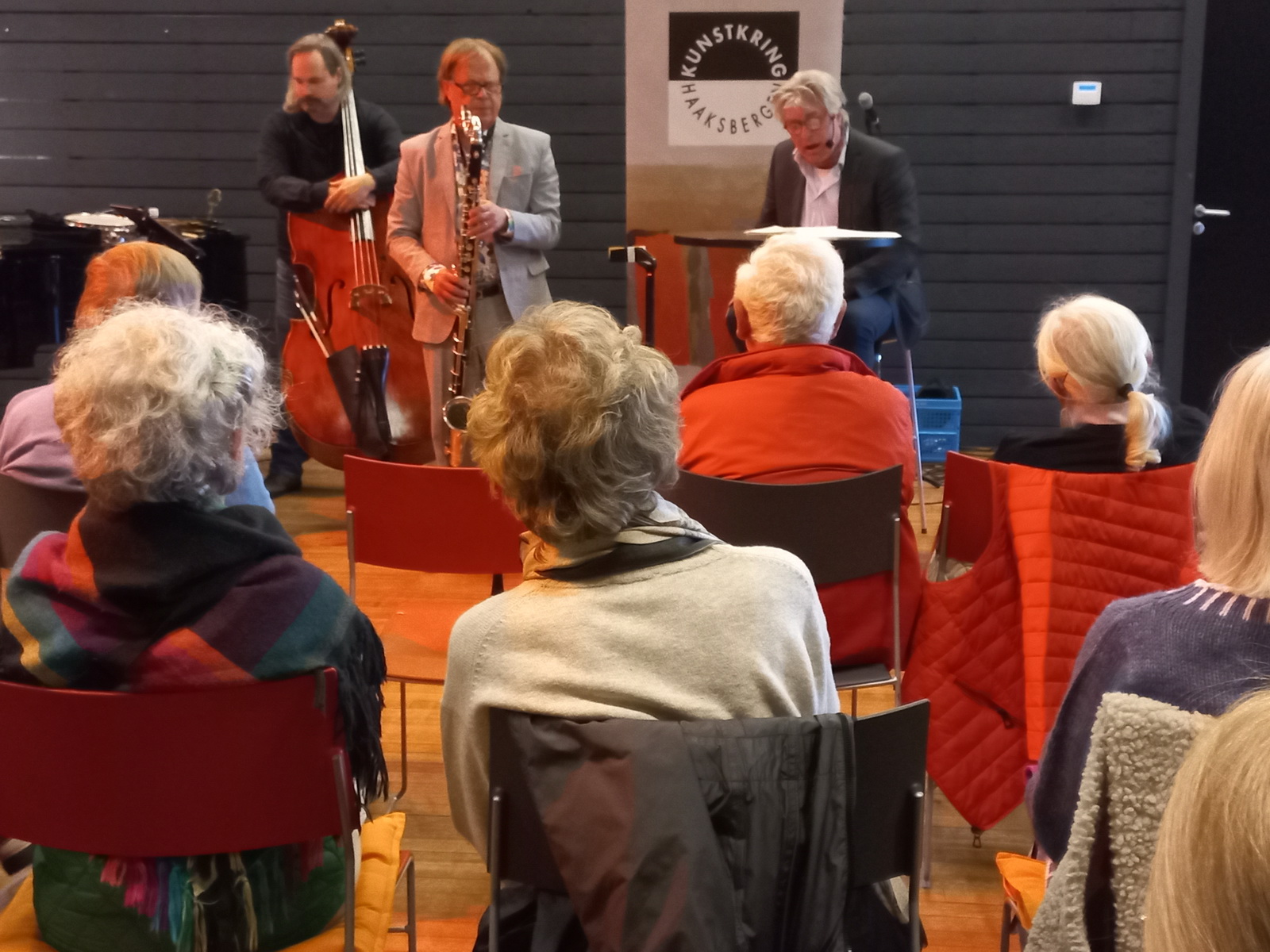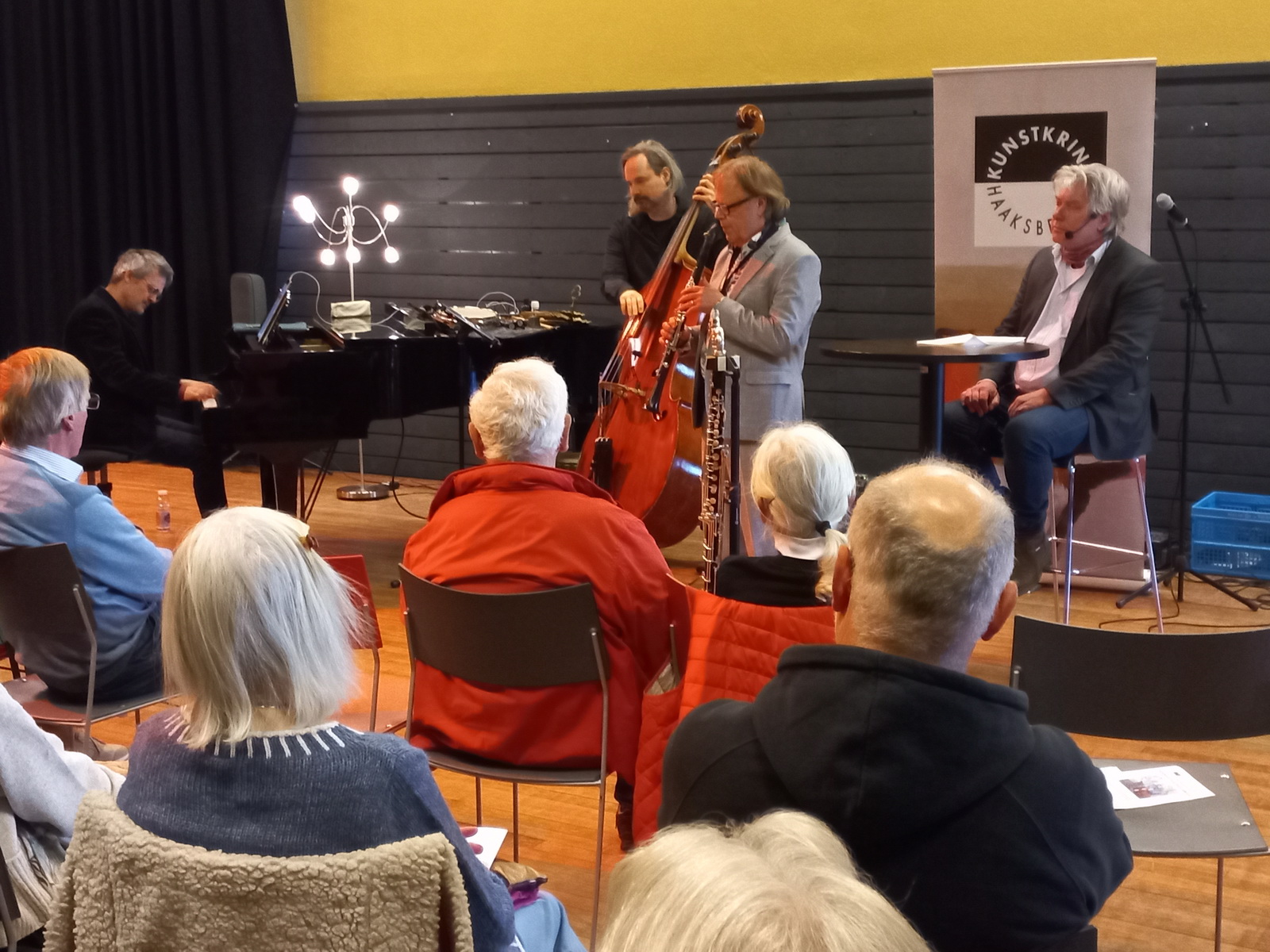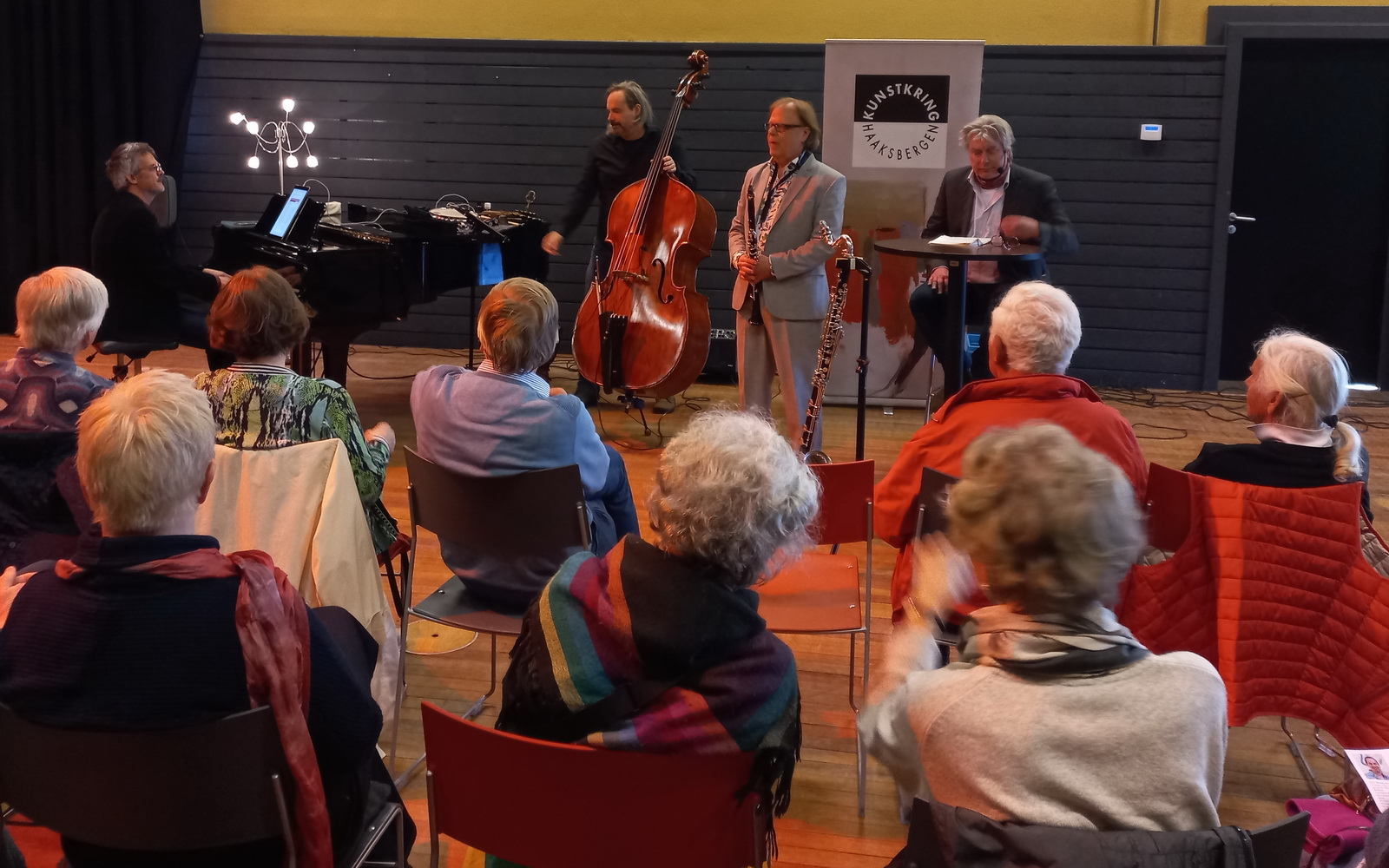 Borboleta Music bracht deze zondagmiddag het programma ‘Muziek en Literatuur’. Het was het laatste concert in de serie zondagmiddagconcerten van het Kunstkringseizoen 2025-2026. Met gast Paul Abels ging klarinettist André Kerver, bijgestaan door Christoph McCarthy op piano en Ulli Wenslaf-Eggebert op contrabas, op zoek naar de grenzen en raakvlakken met de geschreven literatuur. Dit zondagmiddagconcert van de Kunstkring Haaksbergen was de reprise van een concert in november vorig jaar in Jazz Podium de Tor in Enschede. Maar geheel passend bij het uitgangspunt van Borboleta Music werd het een compleet andere voorstelling, die werd bijgewoond door slechts een kleine 45 liefhebbers. Tegen een onverwacht mooie lentedag is ook voor zo’n prachtconcert geen kruit gewassen. Maar de wél-aanwezigen hebben genoten van een fantastische middag. De ontroerende, serieuze, humoristiche en soms hilarische korte verhalen van Paul Abels werden virtuoos muzikaal omlijst door de drie improviserende musici.