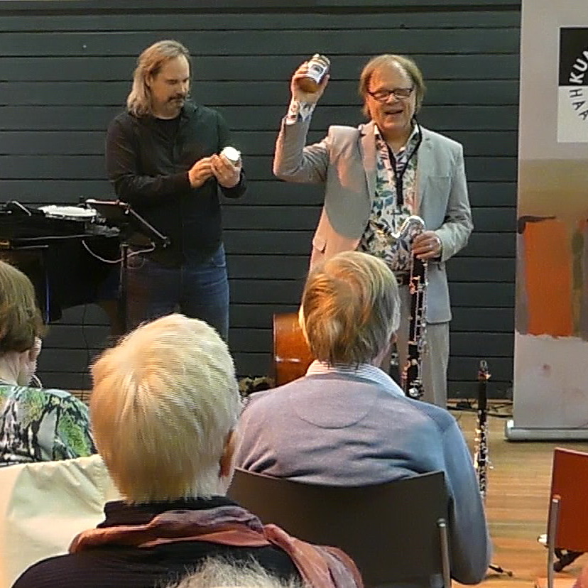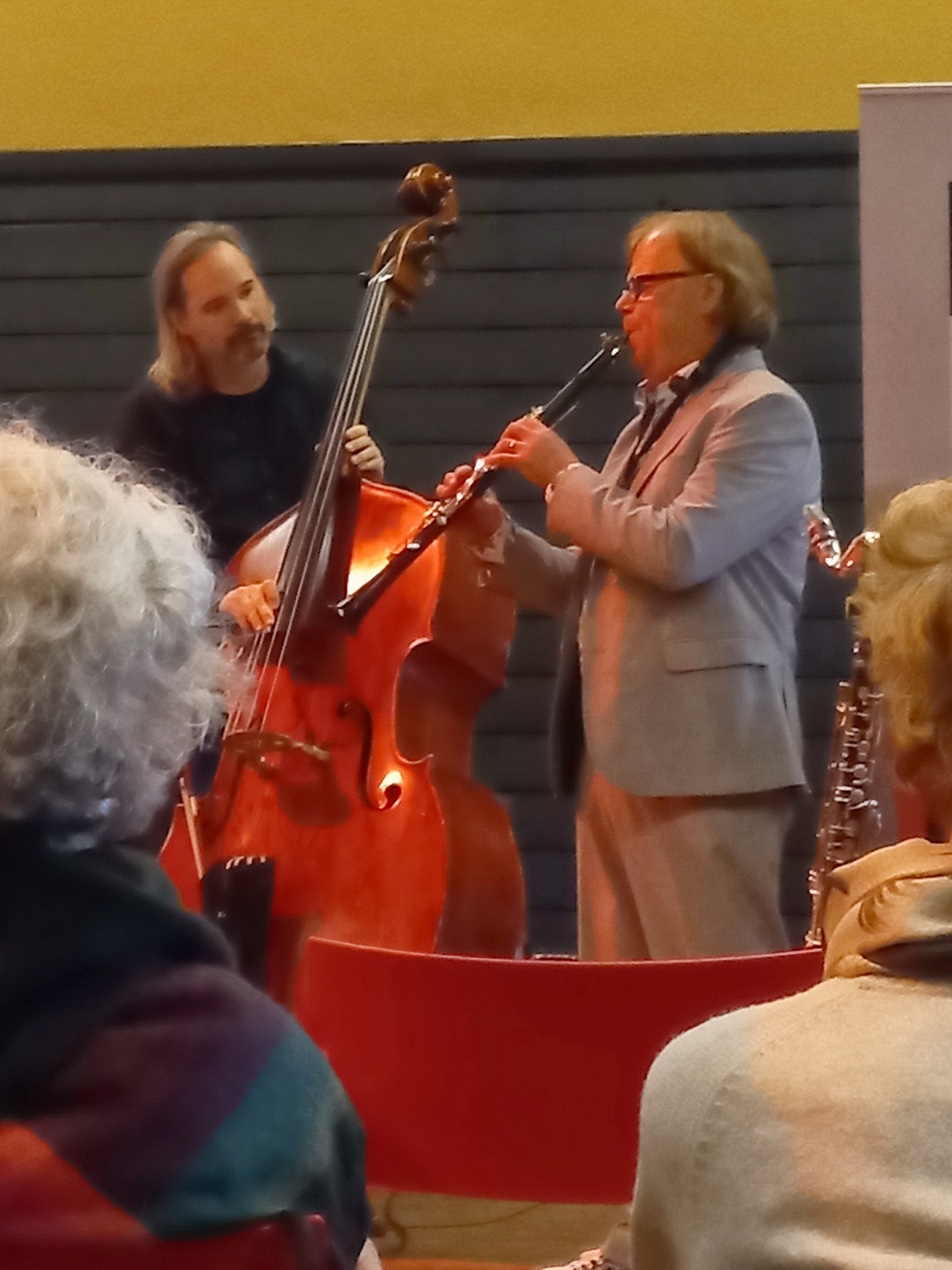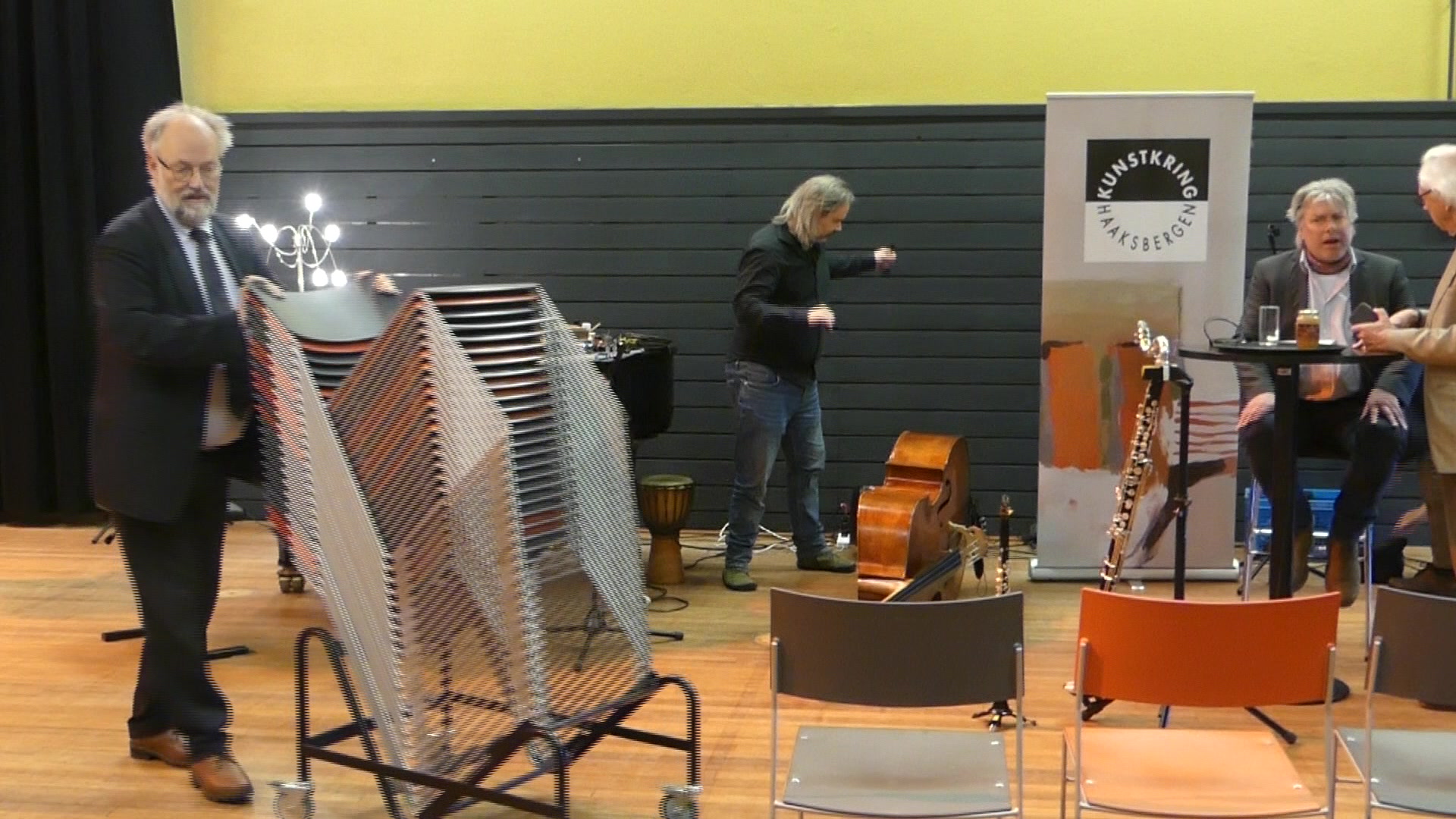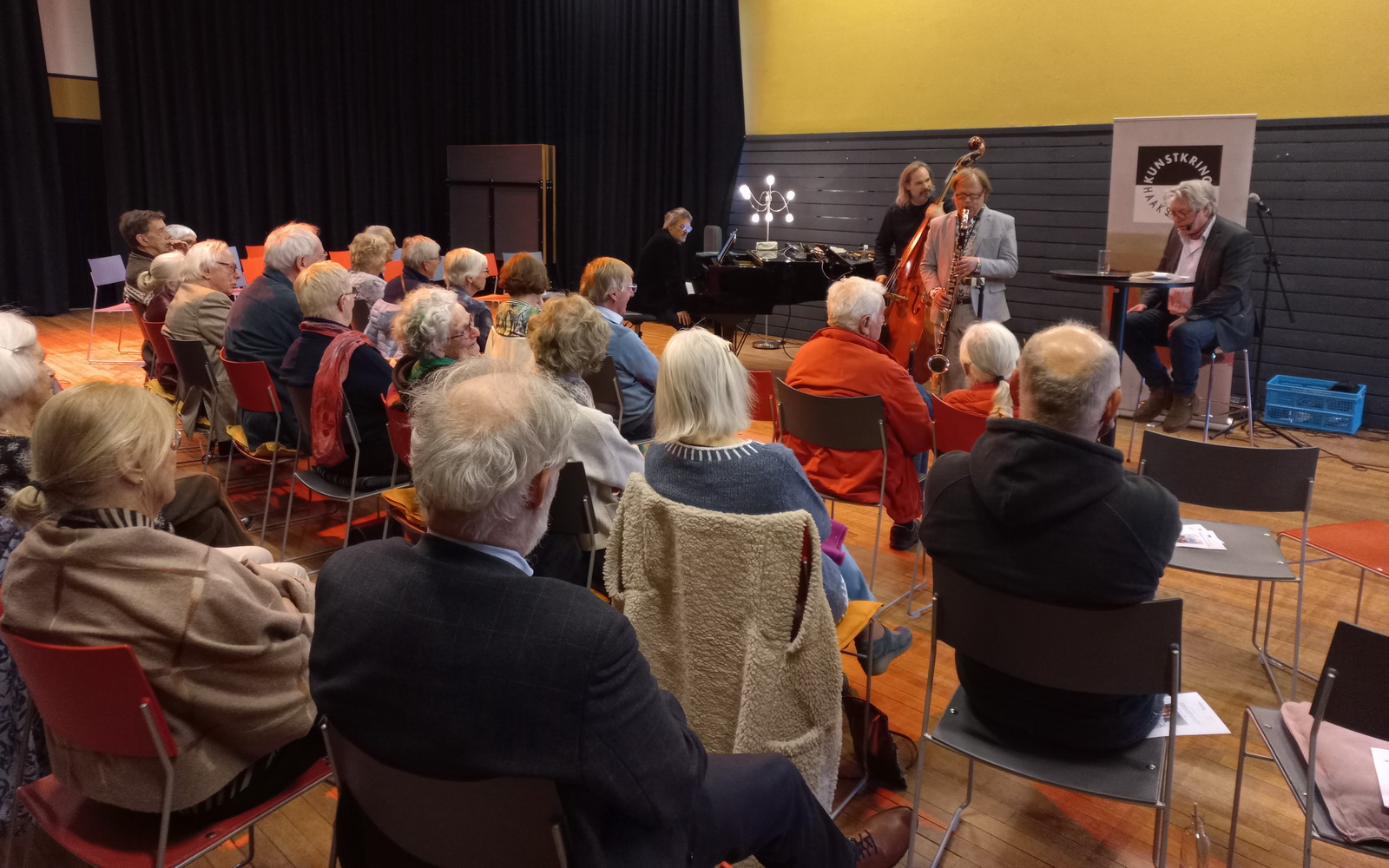 Borboleta Music bracht deze zondagmiddag het programma ‘Muziek en Literatuur’. Het was het laatste concert in de serie zondagmiddagconcerten van het Kunstkringseizoen 2025-2026. Met gast Paul Abels ging klarinettist André Kerver, bijgestaan door Christoph McCarthy op piano en Ulli Wenslaf-Eggebert op contrabas, op zoek naar de grenzen en raakvlakken met de geschreven literatuur. Dit zondagmiddagconcert van de Kunstkring Haaksbergen was de reprise van een concert in november vorig jaar in Jazz Podium de Tor in Enschede. Maar geheel passend bij het uitgangspunt van Borboleta Music werd het een compleet andere voorstelling, die werd bijgewoond door slechts een kleine 45 liefhebbers. Tegen een onverwacht mooie lentedag is ook voor zo’n prachtconcert geen kruit gewassen. Maar de wél-aanwezigen hebben genoten van een fantastische middag. De ontroerende, serieuze, humoristiche en soms hilarische korte verhalen van Paul Abels werden virtuoos muzikaal omlijst door de drie improviserende musici.