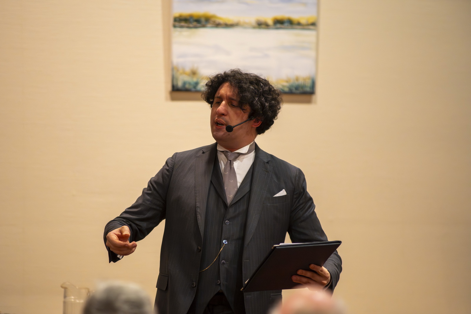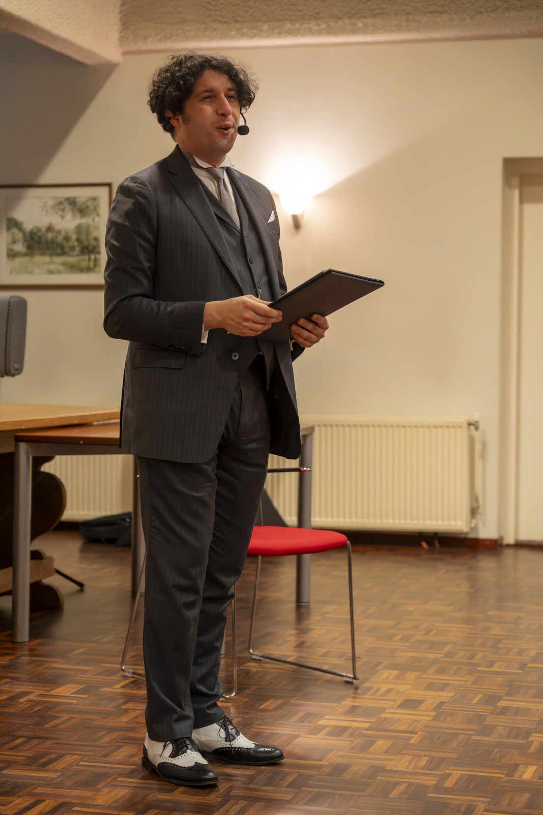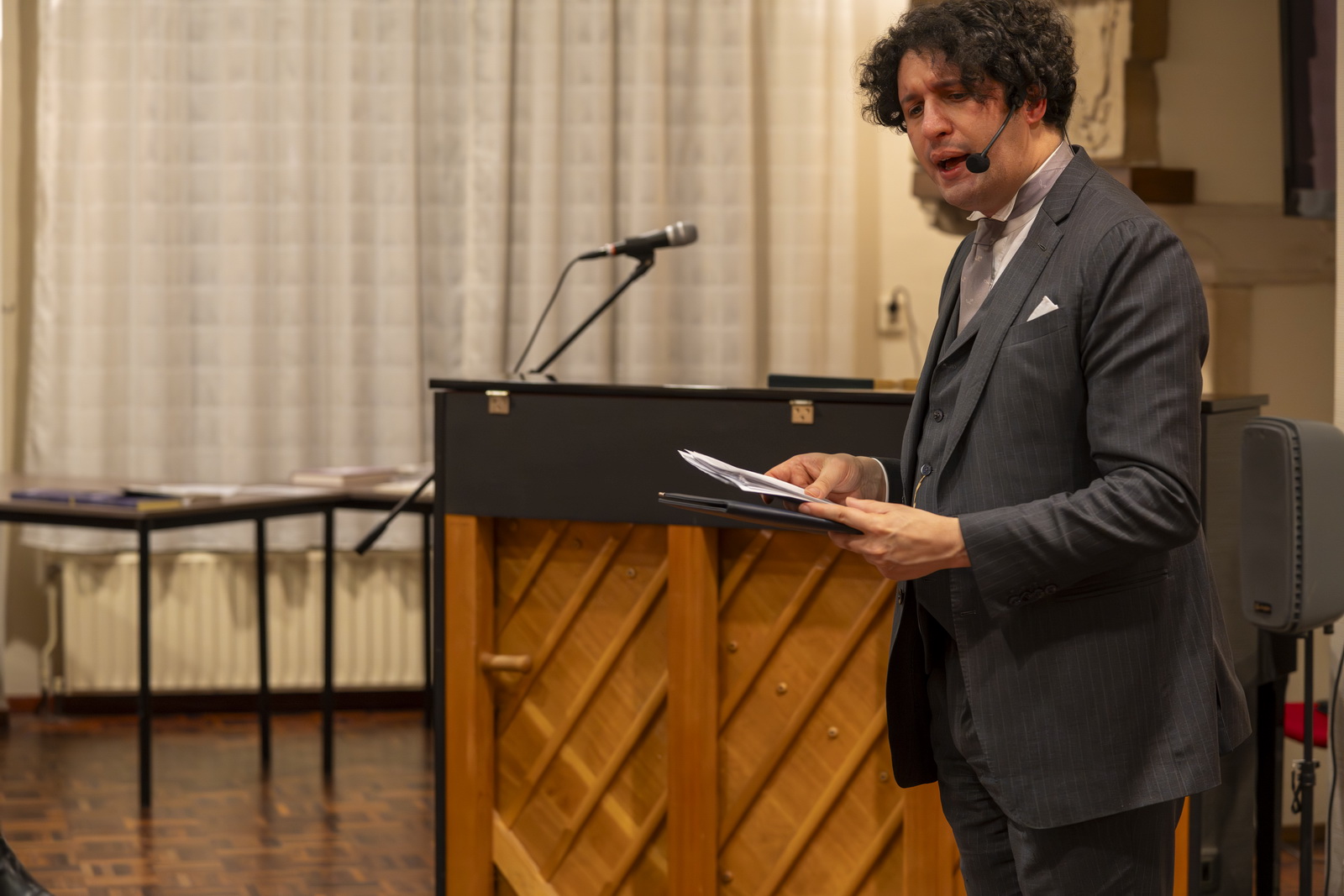 Hoeveel mensen waren er? Een dikke 60 of een kleine zeventig? Het doet er ook helemaal niet toe. Het was in elk geval een zeer goede opkomst en een goed gevulde zaal. Men was gekomen voor een avond ‘Van en over Louis Couperus’. De fantastische voordrachtskunstenaar Simon Mulder bracht bekend en minder bekend werk van Louis Couperus, zoals fragmenten uit de roman ´De berg van licht´, en de vertederende korte verhalen ‘Het spoorwegongeluk’ en ‘Het verbeelde leven’. Hij deed dat met zoveel flair dat De Richtershof moeiteloos voor je geestesoog veranderde van treincoupé naar Scheveningse boulevard, en van salon naar Operatheater. Tussen de fragmenten door vertelde Simon enkele anekdotes over de grote schrijver. Pianist Daan van de Velde speelde met veel gevoel bijbehorende muziek van o.a. Rubinstein, Gounod en Wagner. Daan van de Velde en Simon Mulder besloten de voorstelling met een declamatorium (een door muziek begeleide voordracht) op Couperus’ beroemde korte thriller ‘De binocle’. Het werd door de enorme verbeeldingskracht van zowel de tekst en door de geweldige performance het absolute hoogtepunt van een buitengewoon geslaagde Kunstkringavond