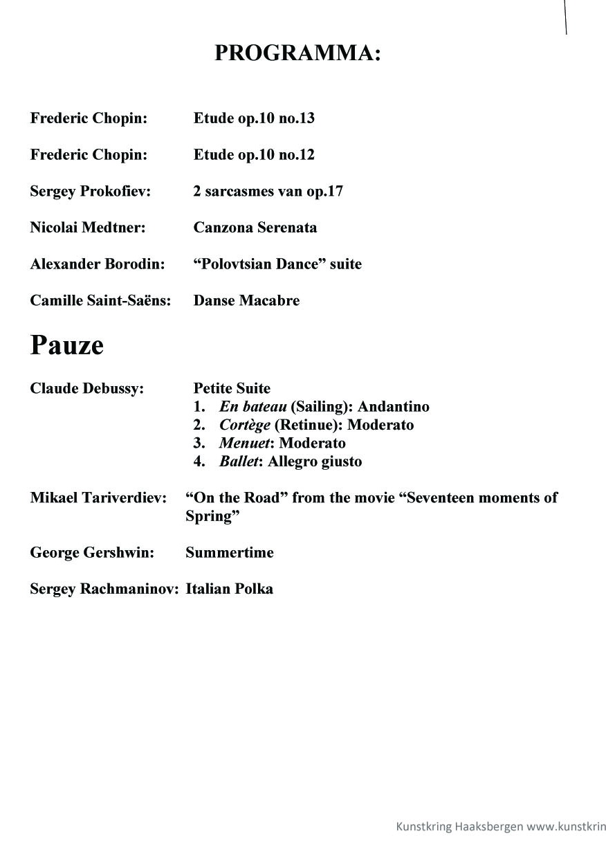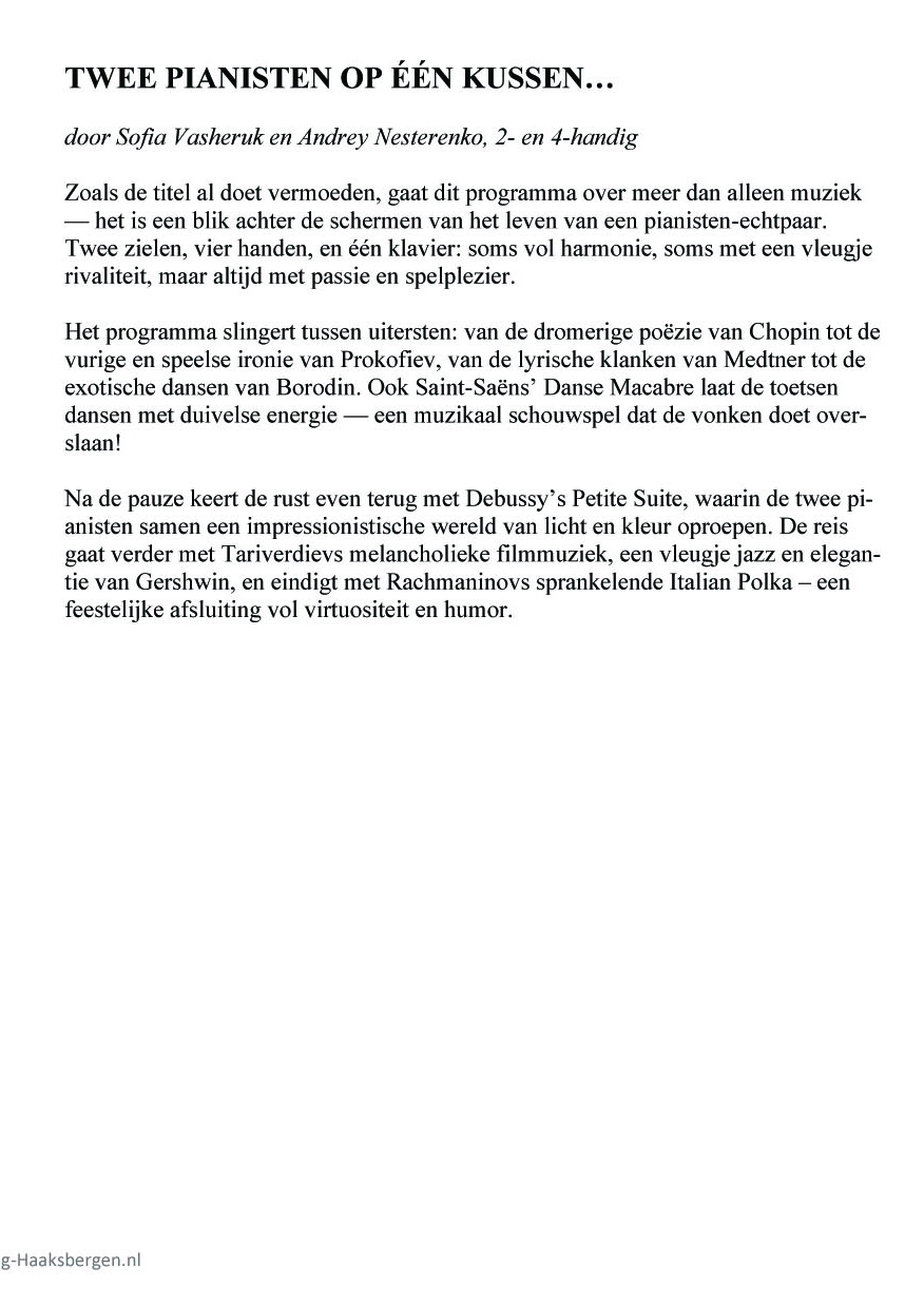 Ondanks het gure najaarsweer waren er toch zo’n kleine zestig muziekliefhebbers naar de kleine zaal van De Kappen gekomen. Daar traden Sofia Vasheruk en Andrey Nesterenko op met een programma voor piano 2- en 4-handig. Sofia begon met Chopins Etude op.10 no.13. Waarna Andrey haar plek achter de vleugel overnam voor een uitvoering van Chopins Etude op.10 no.12. Beide pianisten speelden elk nog één keer 2-handig: Sofia interpreteerde van Prokofiev 2 sarcasmes uit op.17 en Andrey volgde met Canzona Serenata van Nicolai Medtner. Hierna bestond het programma nog uit louter stukken voor piano à quatre mains Zoals voor de pauze de suite uit de Polowetzer dansen van Borodin en de ‘Danse Macabre’ van Saint-Saens.